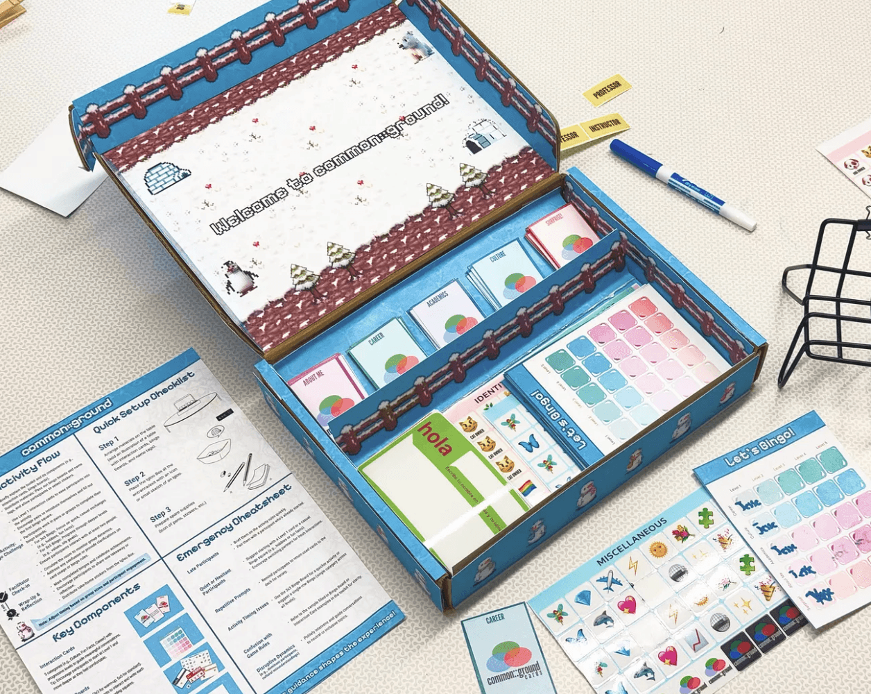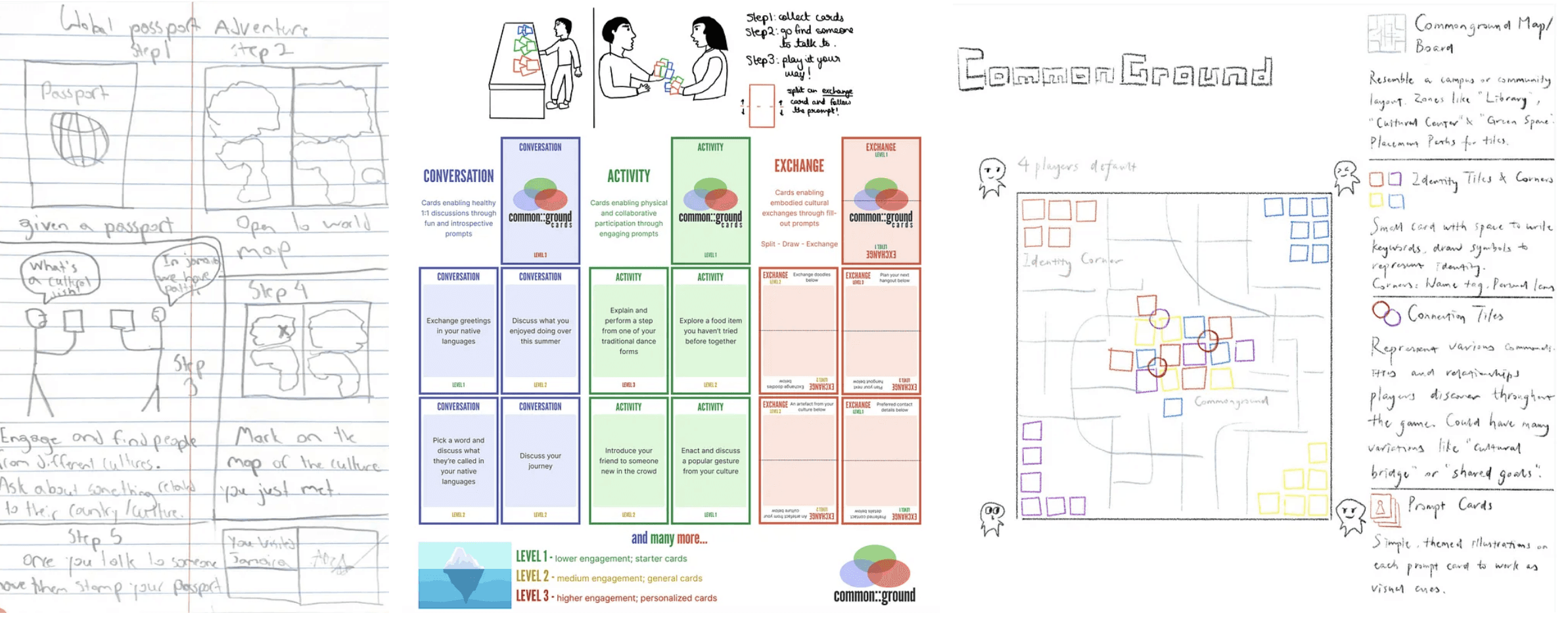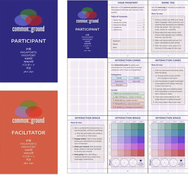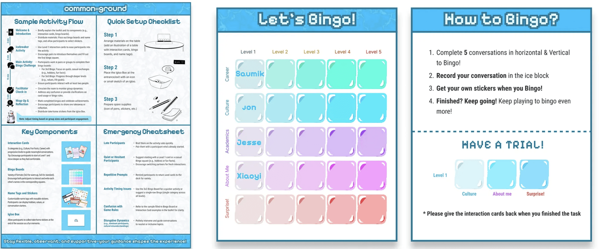 Common::Ground is a gamified, human-centered toolkit designed to empower facilitators to lead inclusive and engaging ice-breaking sessions. With Bingo-inspired prompts, interaction cards, culturally reflective name tags, and playful rewards, it transforms introductions into opportunities for real connection. Built through extensive research, prototyping, and testing, common::ground gives facilitators the structure, flexibility, and creativity they need to bring people together across cultures, personalities, and experiences.