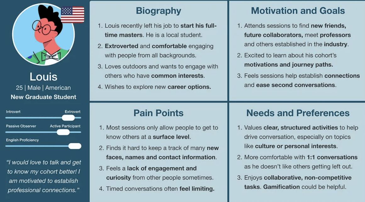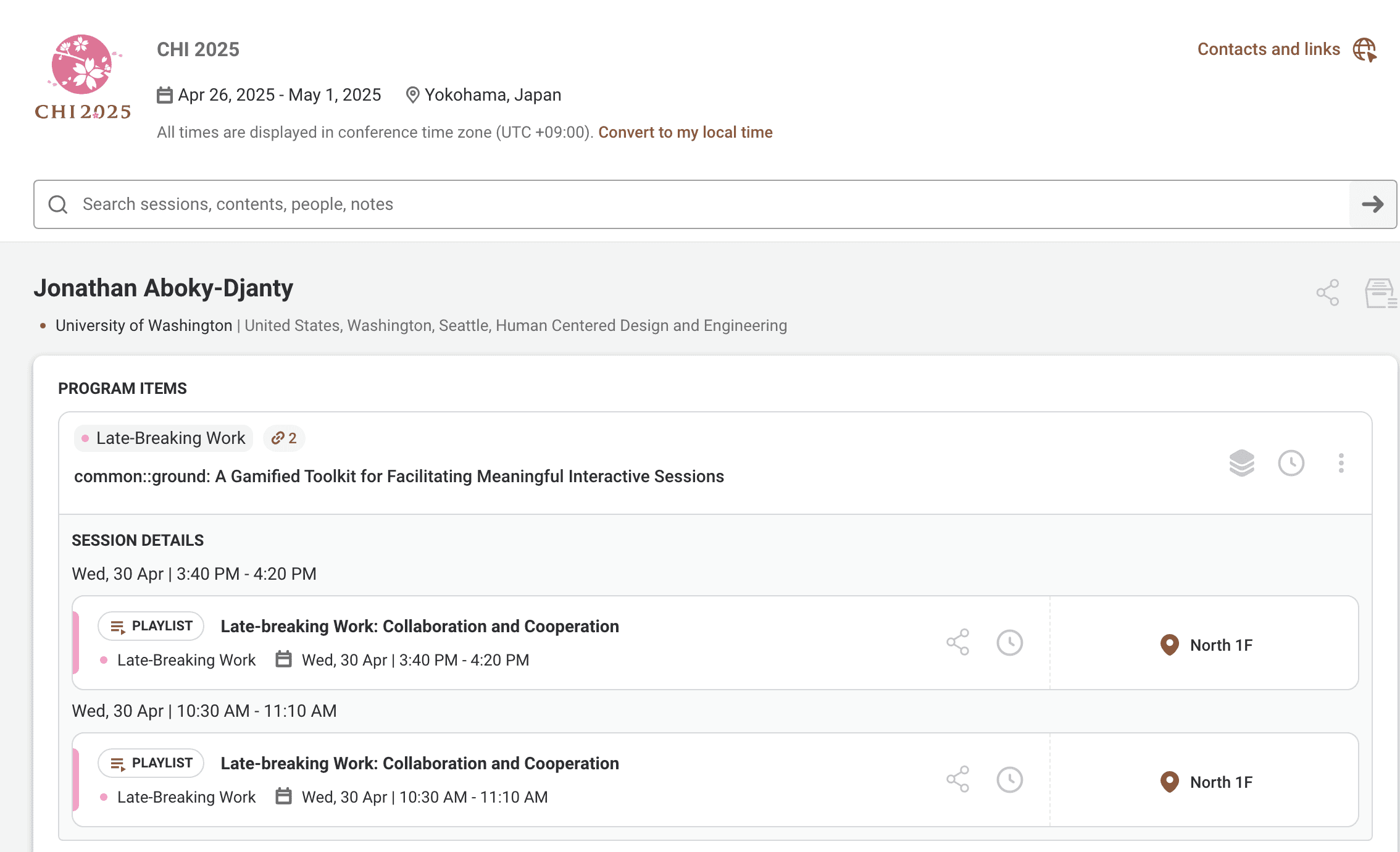 Ice-breaking sessions don’t have to feel awkward or forced. Common::Ground is a toolkit crafted to bring life and energy to these moments, helping facilitators transform introductions into meaningful connections. With features like Bingo-inspired prompts, interactive cards, and fun name tags, it encourages participants to discover shared experiences in a relaxed and engaging way. Common::Ground was born from a deep dive into the challenges of cultural exchange and group interactions. It’s a solution for facilitators to create inclusive, dynamic environments where every participant feels seen, heard, and excited to connect. Common::Ground was selcted out of 1800+ applicants to present at CHI 2025 In Yokohoma, Japan as part of their “Late Breaking Work Exhibit.” Contributons: End to end product develeopment of Common: Ground Led user research through interviews with facilitators and participants to identify key pain points and inform personas and design goals Co-designed core components such as interaction cards and the Bingo-inspired structure, helping shape the toolkit’s interactive experience Conducted usability testing and contributed to refining the visual design while supporting team alignment through structured collaboration and feedback sessions